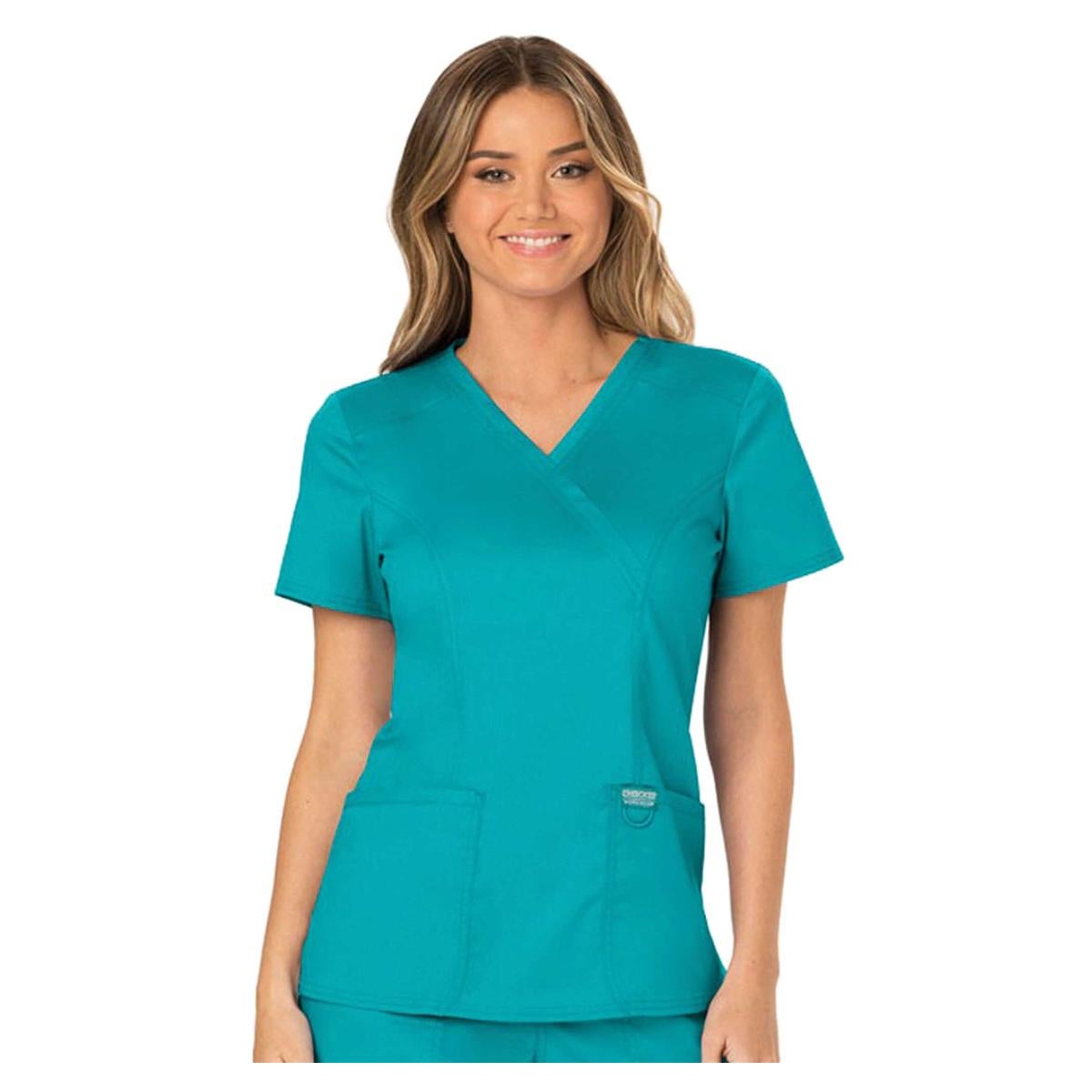 El top femenino cruzado está diseñado con dos prácticos bolsillos inclinados en la parte inferior y pinzas que entallan la cintura para un ajuste perfecto. Su composición de materiales ofrece comodidad y flexibilidad: 78% poliéster, 20% rayón y 2% spandex, ideal para largas jornadas laborales.