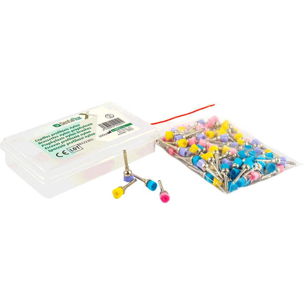 Cepillos de profilaxis fabricados en nylon. Diseñados específicamente para procedimientos de limpieza dental, estos cepillos ofrecen una durabilidad excepcional y un rendimiento eficaz en la remoción de placa y manchas superficiales. Aprovecha el diseño innovador para una mayor eficiencia en cada sesión clínica.