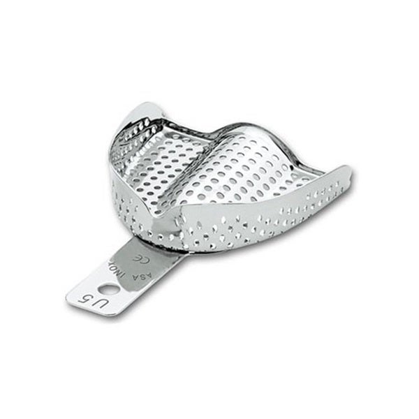 La cubeta perforada está fabricada en acero inoxidable de alta calidad, lo que le otorga durabilidad y resistencia. Es un instrumento diseñado para procedimientos dentales, optimizado para ofrecer un ajuste seguro y preciso. Su diseño sin bandas retentivas permite una fácil limpieza y un uso eficiente en el entorno clínico.