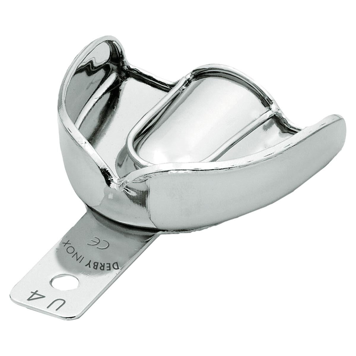 Cubeta para impresión con bordes, diseñada específicamente para la toma de impresiones dentales en el maxilar superior, sector cuadrante U4. Esta herramienta facilita la obtención de moldes precisos gracias a su diseño anatómico y bordes definidos, proporcionando al profesional un ajuste ideal.