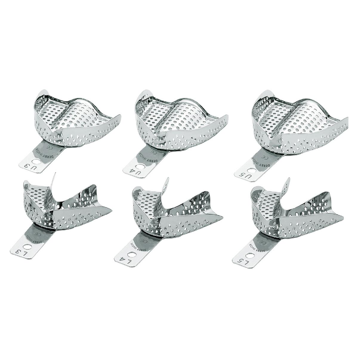 El kit incluye cubetas de impresión perforadas diseñadas para mejorar la retención del material de impresión. Cada juego contiene 6 unidades con diferentes tamaños para adaptarse a diversas medidas dentales. Fabricadas con materiales resistentes, estas cubetas ofrecen durabilidad y eficacia en procedimientos odontológicos, asegurando una aplicación precisa y detallada.
