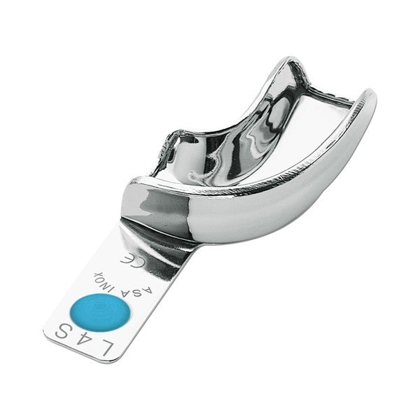 Las cubetas están elaboradas en acero inoxidable, destacando por su durabilidad y resistencia a la corrosión. Incorporan bordes retentivos tipo Rimlock, asegurando una óptima sujeción del material de impresión. La cubeta parcial izquierda se presenta sin perforaciones, ideal para aplicaciones específicas que requieren una máxima precisión en el ajuste. Este diseño asegura un resultado altamente fiable y cómodo para el usuario.