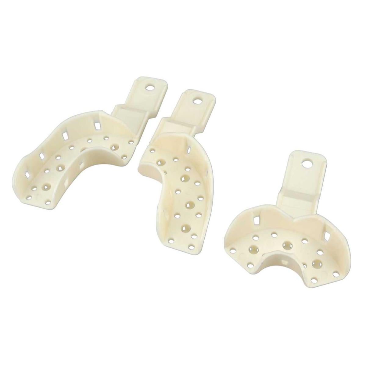 Las cubetas de impresión están elaboradas en material rígido y perforado, diseñadas para asegurar una retención óptima del material de impresión. Su estructura robusta permite una manipulación precisa y segura al tomar impresiones dentales.