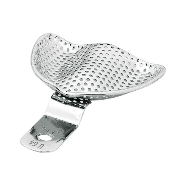 Cubetas perforadas para desdentados fabricadas en acero inoxidable de alta calidad, diseñadas específicamente para proporcionar un ajuste seguro y estable al realizar impresiones dentales. Estas cubetas cuentan con un borde retentivo que asegura la máxima precisión en la toma de impresiones, optimizando el proceso de trabajo clínico con su diseño ergonómico y eficiente.