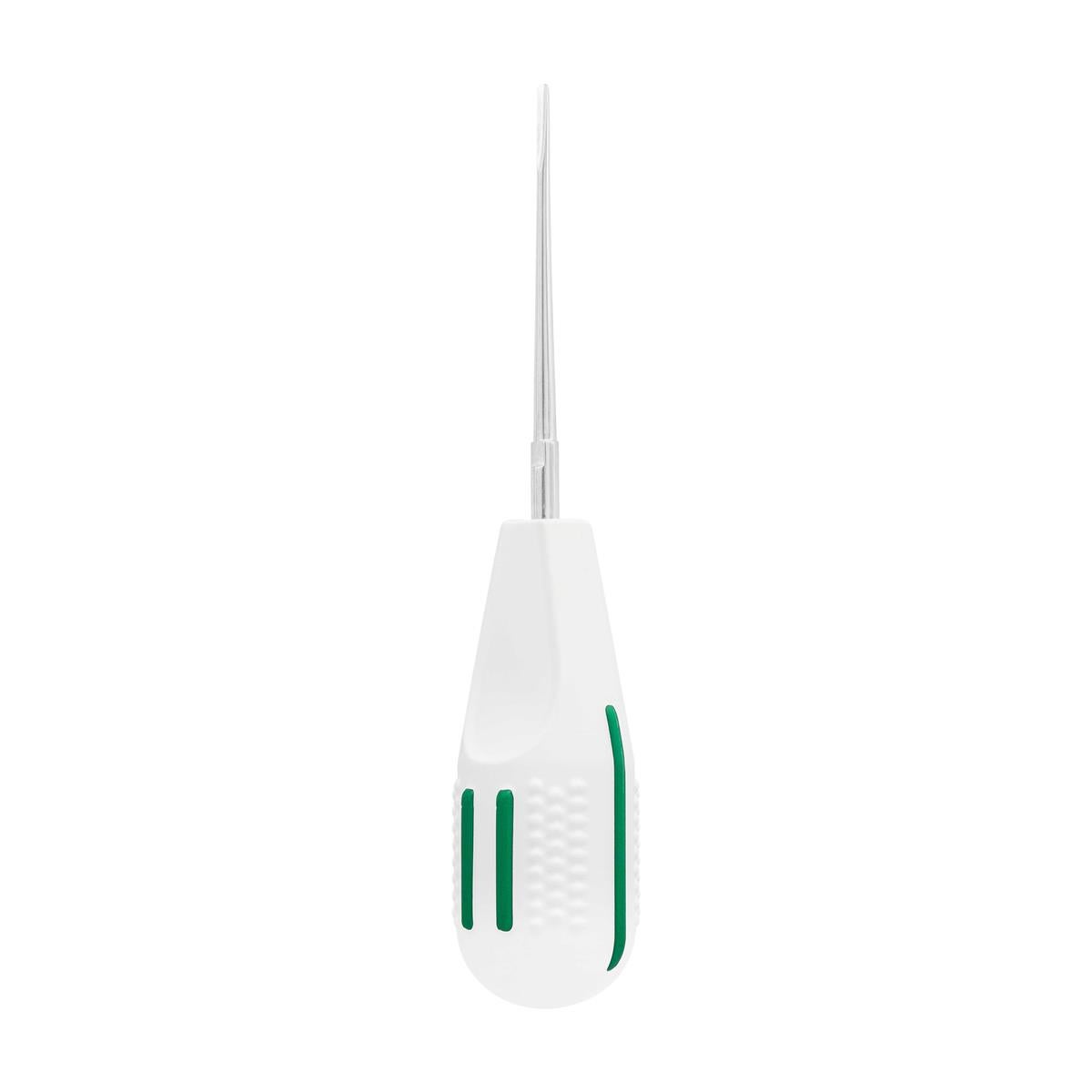 Elevador atraumático diseñado para realizar extracciones dentales eficientes y seguras. Su punta afilada de 5 mm permite cortar suavemente los ligamentos periodontales, reduciendo el riesgo de lesiones en los tejidos blandos y evitando fracturas durante la extracción dental. La fabricación ergonómica del mango facilita el control total y permite aplicar solo la fuerza necesaria.