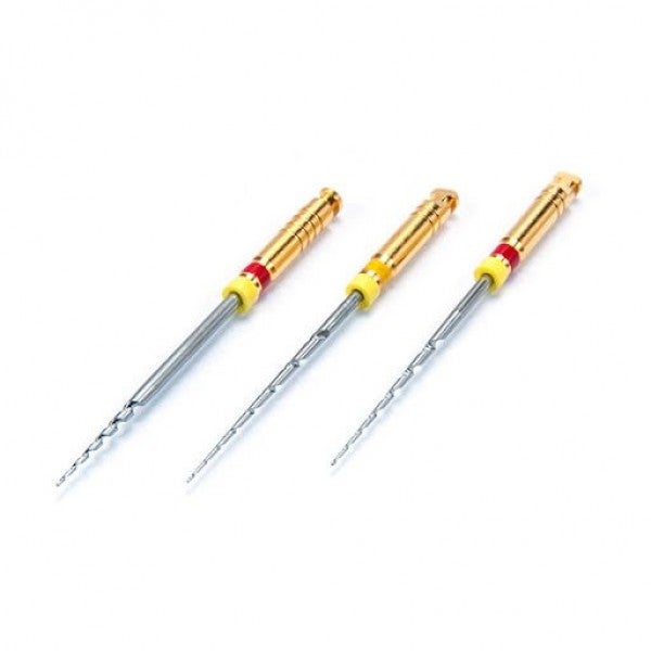 Limas rotatorias con diseño transversal único que optimiza el corte y previene fracturas. Su innovador tratamiento térmico proporciona gran flexibilidad, manteniendo eficiencia y seguridad, eliminando el efecto de atornillado. Sensación táctil suave que asegura la formación de conductos de manera eficiente.