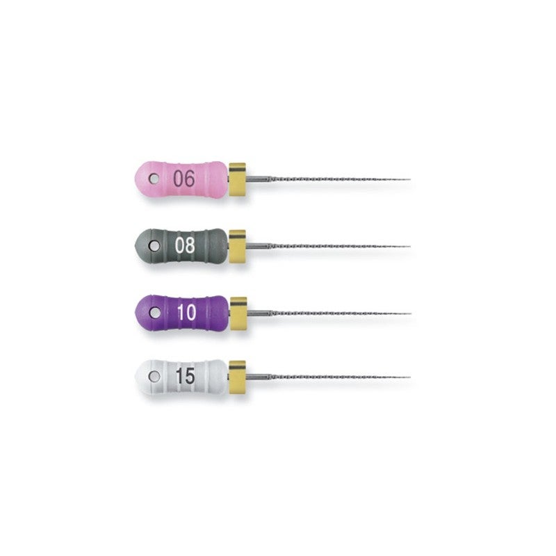 Estas limas endodónticas están diseñadas para optimizar la instrumentación inicial en los canales radiculares. Ofrecen una resistencia a la torsión superior, lo que facilita la localización de los orificios canalares con mayor eficacia. Equipadas con una punta de sección piramidal, proporcionan un rendimiento óptimo para la cateterización de los canales radiculares, destacando su longitud estándar de 25 mm.