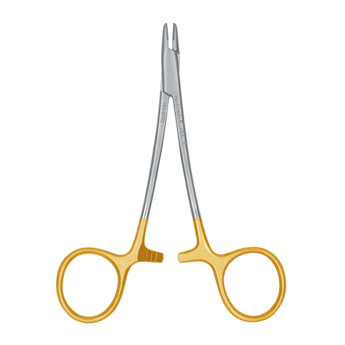 Instrumento preciso de 11,5 cm de longitud diseñado para proporcionar una sujeción segura y efectiva de agujas en procedimientos clínicos. Incorpora inserciones de tungsteno con una forma piramidal que minimizan el deslizamiento o rotación, garantizando la estabilidad necesaria para un trabajo profesional.