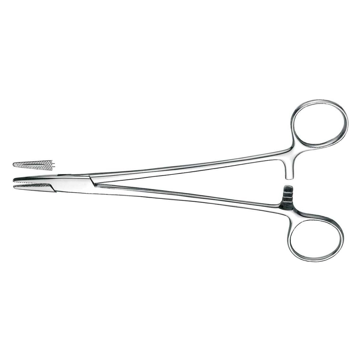 El porta agujas recto de 16 cm presenta un sistema de cierre tipo cremallera. Está diseñado para un manejo preciso y seguro, manteniendo la aguja estable durante su uso. Sus concavidades y estrías internas aseguran un agarre firme, evitando deslizamientos y facilitando el control durante los procedimientos.