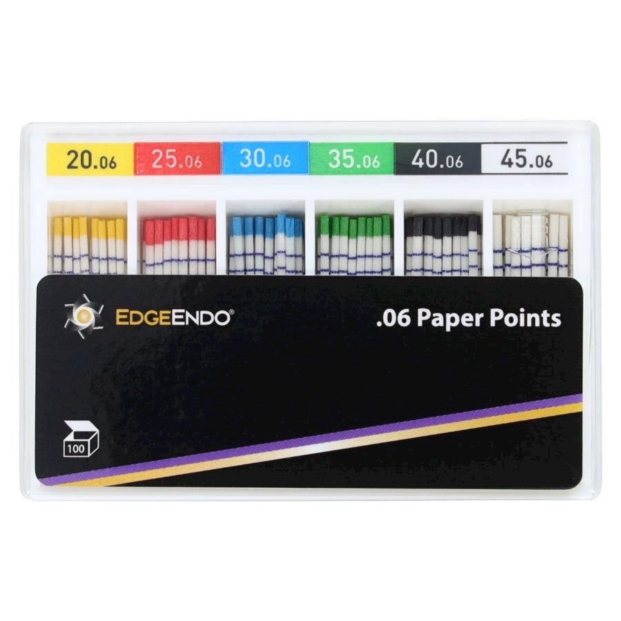 Las Puntas de Papel EdgeEndo™ están diseñadas para una absorción rápida y precisa de la humedad en el conducto radicular, garantizando una obturación más limpia y eficaz. Fabricadas con papel de alta pureza, presentan una conicidad constante .04 y .06 y marcas de longitud que facilitan la inserción exacta en el conducto, evitando sobreinstrumentación.