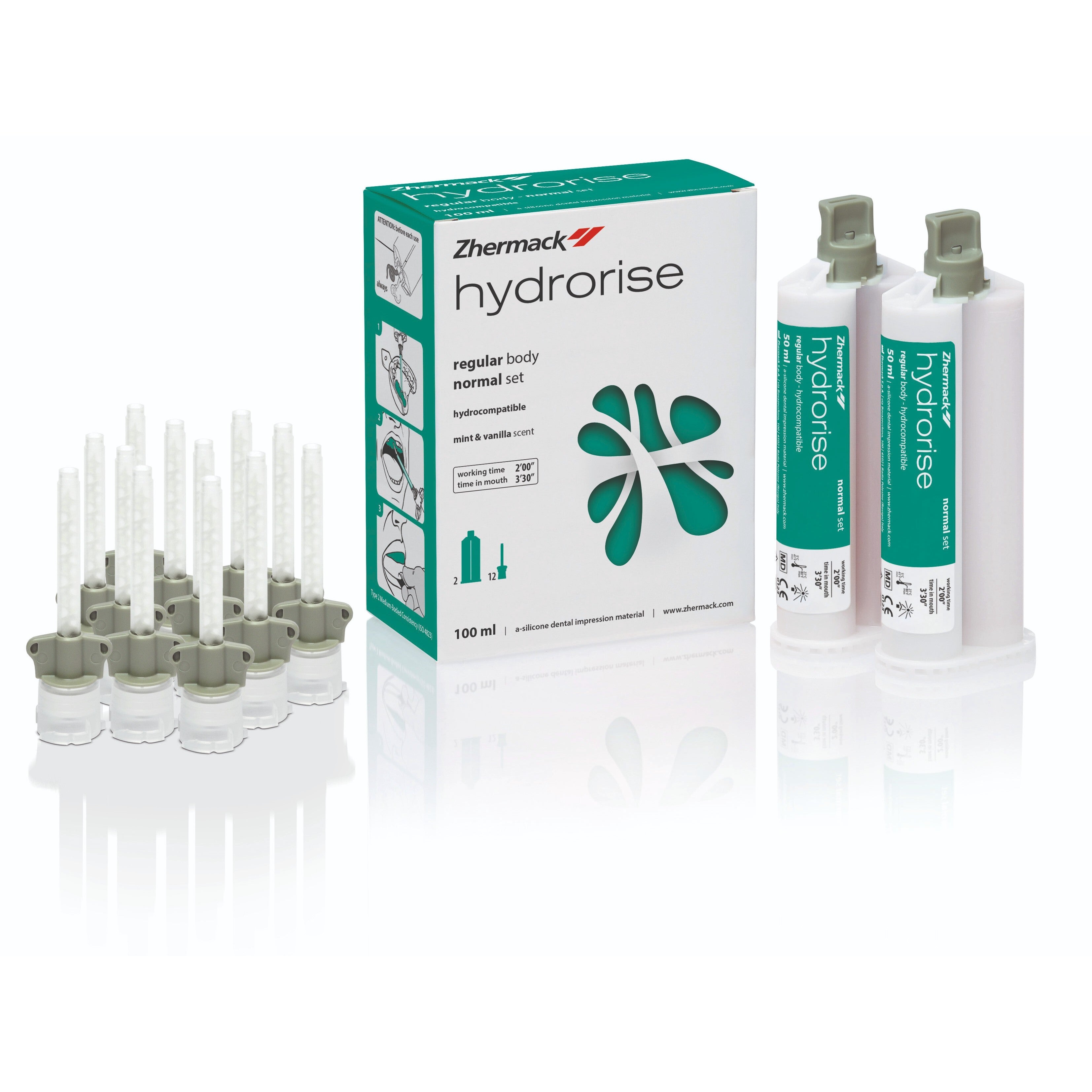 Hydrorise Regular Body es una silicona por adición (vinil polisiloxano) de viscosidad media con proporción de mezcla 1:1, especialmente recomendada para la técnica de un paso (simultánea) en combinación con Hydrorise Putty. Ofrece máxima precisión, excelente reproducción de detalles y una estabilidad dimensional prolongada de hasta 21 días.