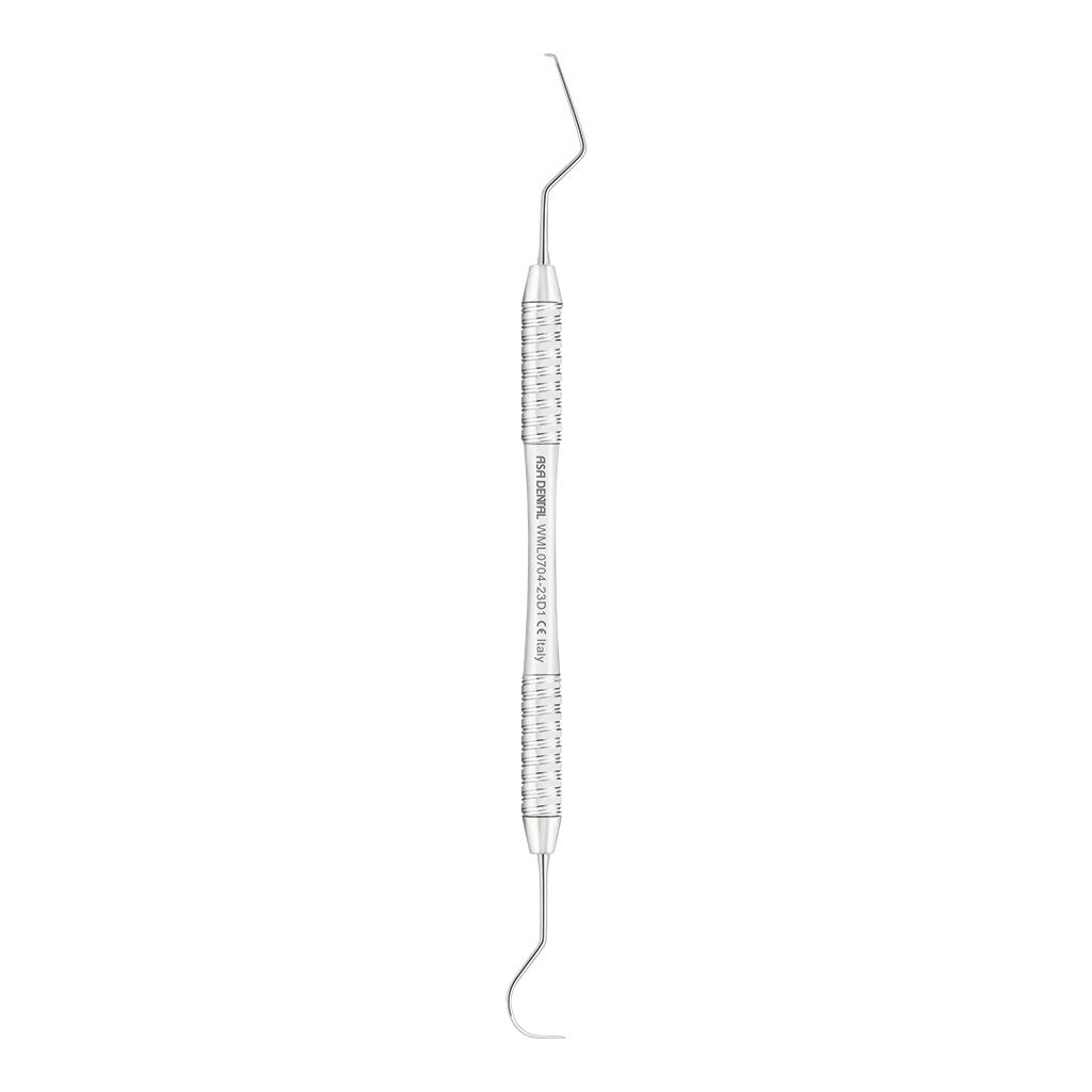 Sonda doble diseñada para la exploración precisa en tratamientos endodónticos. Cuenta con dos extremos específicamente calibrados, uno de 23 y otro de 17, que facilitan su uso en diversos procedimientos odontológicos.