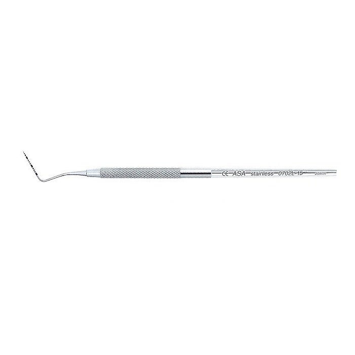 La sonda periodontal CP15 4-5-9-10-14-15 0702L-15 ASA está diseñada con precisión para ofrecer una medición eficaz de la profundidad de los surcos periodontales. Fabricada en acero inoxidable de alta calidad, asegura durabilidad y resistencia a la corrosión. La sonda viene marcada con bandas de color a intervalos específicos de milímetros que facilitan la lectura precisa de las medidas, permitiendo un diagnóstico periodontal confiable.